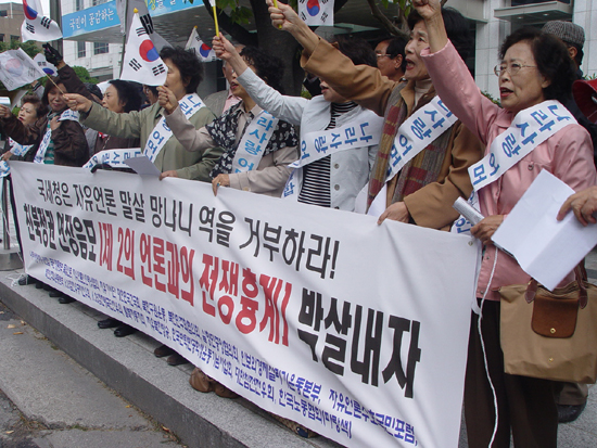 À̳¯ ¸ðÀΠȸ¿øµéÀº '¾ð·ÐÀÚÀ¯ º¼¸ð ÀâÈù ³²ºÏ ¾ð·ÐÇÕÀǼ¸¦ Æó±âÇ϶ó!', '±è´ëÁß Áý±Ç ´ç½Ã ÀÚÀ¯¾ð·ÐÁ×À̱â Áø»óÀ» ¹àÈ÷¶ó!', '³ë¹«ÇöÀÇ Á¦2ÀÇ ¾ð·Ð°úÀÇ ÀüÀïÀ» Áï°¢ Áß´ÜÇ϶ó!', 'º®µ¹Àå Å×·¯¿Í Á¶¼±ÀϺ¸ Á×À̱âÀÇ ¹èÈĸ¦ ¹àÈ÷¶ó!', '±¹¼¼Ã»Àº ÀÚÀ¯¾ð·Ð ¾Ð»ì ¸Á³ª´Ï ¿ªÇÒÀ» Áß´ÜÇ϶ó!'µîÀÇ ±¸È£¸¦ ¿ÜÄ¡±âµµ Çß´Ù.