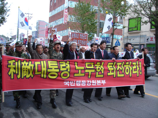 À̳¯ ¸ðÀÎ ´Üü ȸ¿øµéÀº '¹Ý¿ª°øÁ¶ ÀÌÀû´ëÅë·É ³ë¹«Çö ÅðÁøÇ϶ó!, û¿Í´ë¿¡ ¼û¾îÀÖ´Â °£Ã¸¼¼·Â ¸ô¾Æ³»ÀÚ!, ÇÙÆøÅºÀ¸·Î µ¹¾Æ¿Â ´ëºÏÆÛÁÖ±â Áß´ÜÇ϶ó!, ±èÁ¤ÀÏÀÇ ÀÚ±ÝÁÙ ±Ý°­»ê°ü±¤ Áß´ÜÇ϶ó!' µîÀÇ ±¸È£¸¦ ¿ÜÄ¡¸ç ¼ÓÃʽó»±îÁö ¾à 30ºÐ°£ ÇàÁøÀ» ÁøÇàÇϱ⵵ Çß´Ù.