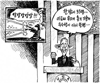 ¼¿ï½Å¹® ¹é¹«Çö ȹéÀº 17ÀÏÀÚ ¸¸Æò¿¡¼ ¡°Çѹ濡 33¸í¡¦. ÀÌ·Î½á ¿ì¸®ÀÇ Ãѱ⠱â¼úÀÇ ¿ì¼ö¼ºÀ» ´Ù½Ã Çѹø..¡±À̶ó´Â ºÎ½Ã ¹Ì±¹ ´ëÅë·ÉÀÇ ¸ð½ÀÀ» ±×·È´Ù. ÀÌ´Â ½ÇÀÇ¿¡ ºüÁø ¹Ì±¹ »çȸ¿Í Èñ»ýÀÚµéÀ» Á¶·ÕÇß´Ù´Â ºñ³À» ¹ÞÀ» °¡´É¼ºÀÌ ³ô´Ù.