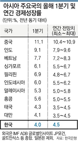 ¿Ü±¹ÀÇ ¿ÃÇØ ¼ºÀå·ü Àü¸ÁÄ¡´Â Çѱ¹ÀºÇàÀÌ ±¹Á¦Åëȱâ±Ý(IMF), ¾Æ½Ã¾Æ°³¹ßÀºÇà(ADB) µî ±¹Á¦±â±¸¿Í JP¸ð°Ç, °ñµå¸¸»è½º µî 5°³ ÅõÀÚÀºÇàÀÇ Àü¸ÁÄ¡¸¦ Á¾ÇÕ ºñ±³ÇÑ °á°ú´Ù. Çѱ¹Àº 1ºÐ±â(1¡3¿ù) ±¹³»ÃÑ»ý»ê(GDP) ¼ºÀå·üÀÌ 4.0%·Î ÀϺ»(2.0%)À» Á¦¿ÜÇÑ ¾Æ½Ã¾Æ ÁÖ¿ä±¹ °¡¿îµ¥ ÃÖÇÏÀ§¿´´Ù.