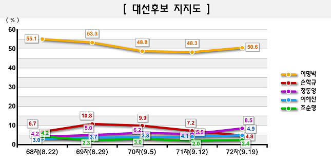 20ÀÏ Áß¾ÓÀϺ¸°¡ ¹ßÇ¥ÇÑ ¿©·ÐÁ¶»ç °á°ú, ´ëÅëÇÕ¹ÎÁֽŴç â´ç ÀÌÈÄ ÁÙ°ï ¼ÕÇÐ±Ô Àü °æ±âµµÁö»ç¿¡°Ô ¹Ð·È´ø Á¤µ¿¿µ Àü ¿¸°¿ì¸®´ç ÀÇÀåÀÌ 2À§¿¡ ¿Ã¶ú´Ù. ÁÙ°ð 1À§¸¦ ´Þ¸®°í ÀÖ´Â À̸í¹Ú Àü ¼¿ï½ÃÀåÀº Áö³ ÁÖ Á¶»çº¸´Ù 2.3% Æ÷ÀÎÆ® »ó½ÂÇÑ 50.6%ÀÇ ÁöÁöµµ¸¦ º¸ÀÌ¸ç ´Ù½Ã 50% ´ë¸¦ ȸº¹Çß´Ù.