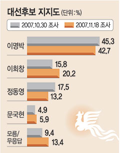 ¹®ÈÀϺ¸¿Í ¿©·ÐÁ¶»ç±â°üÀÎ µð¿ÀÇÇ´Ï¿ÂÀÌ 18ÀÏ Àü±¹ ¼ºÀγ²³à 1000¸íÀ» »ó´ë·Î ÇÑ ÀüȸéÁ¢ ¿©·ÐÁ¶»ç¿¡¼ '´ëÅë·É È帷Π´©±¸¸¦ ÁöÁöÇÒ °ÍÀ̳Ä'´Â Áú¹®¿¡ À̸í¹Ú Èĺ¸ 42.7%, ÀÌȸâ Èĺ¸ 20.2%, Á¤µ¿¿µ Èĺ¸ 13.2% ¼øÀ¸·Î ³ªÅ¸³µ´Ù. ÀÌ¾î ¹®±¹Çö âÁ¶Çѱ¹´ç Èĺ¸ 5.9%, ±Ç¿µ±æ ¹ÎÁֳ뵿´ç Èĺ¸ 2.9%, ÀÌÀÎÁ¦ ¹ÎÁÖ´ç Èĺ¸ 1.3%, ½É´ëÆò ±¹¹ÎÁ߽ɴç Èĺ¸ 0.4% µîÀÇ ¼øÀ̾ú´Ù.