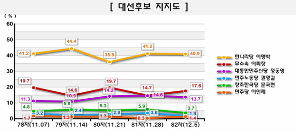 ¹Ìµð¾î´ÙÀ½-R&R°¡ °øµ¿Á¶»çÇϰí 6ÀÏ Áß¾ÓÀϺ¸°¡ ¹ßÇ¥ÇÑ ¡®Á¶Àνº dzÇâ°è¡¯ Á¶»ç¿¡ µû¸£¸é, À̸í¹Ú Èĺ¸ÀÇ ÁöÁöµµ´Â Áö³ÁÖ(41.2%)º¸´Ù 0.3% Æ÷ÀÎÆ® ¶³¾îÁø 40.9%·Î ³ªÅ¸³µ´Ù. ½É´ëÆò Èĺ¸ÀÇ ÁöÁö¸¦ ¾÷Àº ¹«¼Ò¼Ó ÀÌȸâ Èĺ¸ÀÇ ÁöÁöµµ´Â Áö³ÁÖº¸´Ù 2.9% Æ÷ÀÎÆ® »ó½ÂÇÑ 17.6%·Î, ÀÌȸâ Èĺ¸¿Í À̸í¹Ú Èĺ¸ÀÇ ÁöÁöµµ Â÷ÀÌ´Â Áö³ÁÖ(26.5%)º¸´Ù 3.2% Æ÷ÀÎÆ®°¡ ÁÙ¾îµç 23.3%´Ù.