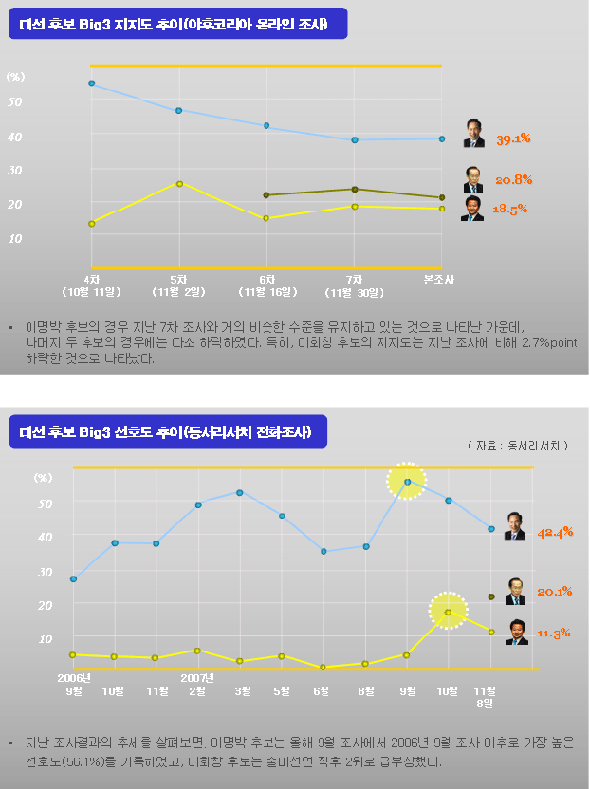 ´ë¼± Èĺ¸ ÁöÁöµµ´Â ¼ö»ç °á°ú ¹ßÇ¥ Àü°ú ºñ±³ÇØ Å« º¯È­¸¦ º¸ÀÌÁö ¾Ê¾Ò´Ù. ¾ßÈÄÄÚ¸®¾ÆÀÇ ¿Â¶óÀÎ ´ë¼± Èĺ¸ ¼±È£µµ Á¶»ç¿¡¼­´Â À̸í¹Ú Èĺ¸ 39.1%, ÀÌȸâ 20.8% Á¤µ¿¿µ Èĺ¸ 18.5%, ¹®±¹Çö 8.8%, ±Ç¿µ±æ 3.1%, ÀÌÀÎÁ¦ 1.0% ¼øÀÇ ÁöÁöÀ²À» ³ªÅ¸³ÂÀ¸¸ç, µ¿¼­¸®¼­Ä¡ÀÇ ÀüÈ­Á¶»ç ´ë¼± Èĺ¸ ºò3 ¼±È£µµ ¿ª½Ã À̸í¹Ú 42.4%, ÀÌȸâ 20.1%, Á¤µ¿¿µ 11.3% ¼øÀ¸·Î ³ªÅ¸³µ´Ù.