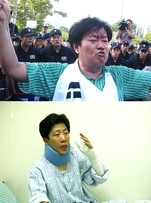 (À§) 2005³â 8¿ù14ÀÏ ³²ºÏÃ౸´ëȸ°¡ ¿¸®´Â »ó¾Ïµ¿¿¡¼ űر⸦ ³ª´²ÁÖ´Ù ÁÂÀ͵鿡°Ô ÆøÇà´çÇØ ÇǸ¦ È긮°í ÀÖ´Â ºÀÅÂÈ«¾¾ÀÇ ´ç½Ã ¸ð½À. (¾Æ·¡) Áö³ ÇØ 7¿ù17ÀÏ ³²ºÏÀå°ü±Þȸ´ãÀÌ ¿¸®´Â ºÎ»ê¿¡¼ ºÏÇÑÀ» ±ÔźÇÏ´Â Áýȸ¸¦ ½ÃµµÇÏ´Ù °æÂû¿¡ ÆøÇà´çÇÑ ¹Ú»óÇо¾ÀÇ ´ç½Ã ¸ð½À.