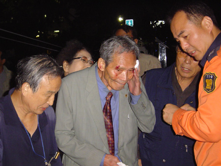 °æÂûÀÇ ¹æÆÐ¿¡ ¸Â¾Æ ¾Õ´Ï°¡ ºÎ·¯Áö°í ÆÈ, ´Ù¸®, ¸Ó¸® µî ½Åü ¿©·¯ ºÎÀ§¸¦ °¡°Ý´çÇÑ ¹Úö¼º(47, ÁÖ±Çã±â½Ã¹Î¸ðÀÓ °øµ¿´ëÇ¥)¾¾´Â '°æÂûÀÌ ¹æÆÐ¿Í Áø¾Ð ºÀÀ¸·Î 60~70´ëÀÇ ³ëÀεéÀ» °¡°ÝÇÏ´Â °ÍÀ» ¸»¸®ÀÚ ¿ÀÈ÷·Á ¹æÆÐ ¸ð¼¸®·Î ¾ó±¼À» °¡°ÝÇß´Ù'¸ç '°æÂûÀÇ °úÀ×Áø¾Ð¿¡ ´ëÇØ ¾Ö±¹½Ã¹Îµé°ú ÁÖÃÖ ÃøÀÌ °øµ¿ ´ëÀÀÇØ¾ß ÇÒ °Í'À̶ó°í ¸»Çß´Ù.