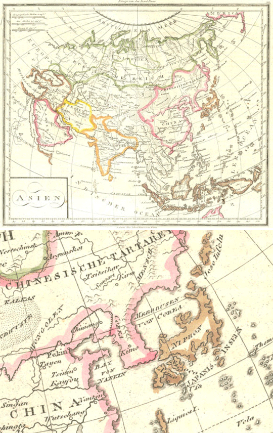 ù ¹øÂ° Áöµµ´Â Å丶½º º¸À© (Thomas Bowen)ÀÌ 1780³â¿¡ ¡®A NEW &; ACCURATE MAP OF ASIA¡¯À̶õ À̸§À¸·Î Á¦ÀÛÇÑ Áöµµ´Ù.