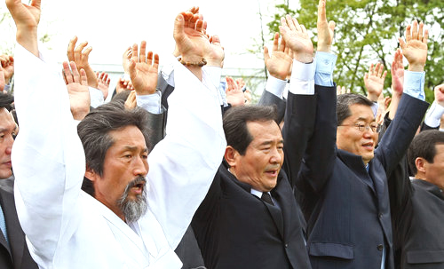 ¹ÎÁÖ´ç Á¤¼¼±Õ ´ëÇ¥¿Í ¹ÎÁֳ뵿´ç °±â°©´ëÇ¥, âÁ¶Çѱ¹´ç ¹®±¹Çö ´ëÇ¥¸¦ ºñ·ÔÇÑ ¾ß 3´ç ¼Ò¼Ó ÀÇ¿øµéÀÌ 15ÀÏ ¿ÀÀü ¼¿ï ȿ⵿ ¹é¹ü ±è±¸ ¼±»ý ¹¦¼Ò¸¦ Âü¹èÇÑ µÚ ¸¸¼¼ »ïâÀ» Çϰí ÀÖ´Ù. À̳¯ ¾ß 3´ç ´ëÇ¥µéÀº Á¤ºÎ°¡ ÁÖÃÖÇÑ °Ç±¹ 60Áֳ⠱â³ä½Ä¿¡ ºÒÂüÇÏ°í ¹é¹ü ¹¦¼Ò¸¦ Âü¹èÇß´Ù.