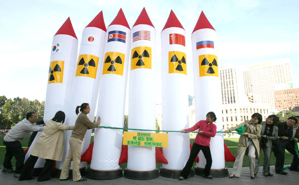 2006³â 10¿ù30ÀÏ ¼­¿ï½Ãû ¾Õ¿¡¼­µµ ȯ°æ¿¬ÇÕ È¸¿øµéÀº ¡ºµ¿ºÏ¾Æ¸¦ ºñÇÙÁö´ë·Î ¸¸µéÀÚ¡»´Â ³»¿ëÀÇ ÇàÀ§±ØÀ» ¹ú¿´´Ù. À̵éÀº ¼º¸í¿¡¼­ ¡º³²ºÏÇÑ¡¤ÀϺ»Àº ºñÇÙÁö´ë Á¶¾àÀ» ü°áÇϰí, Áß±¹¡¤·¯½Ã¾Æ¡¤¹Ì±¹Àº ÇÙ¹«±â °ø°Ý°ú À§ÇùÀ» ±ÝÁöÇÏ´Â ¼Ò±ØÀû ¾ÈÀüº¸Àå¿¡ Âü¿©ÇÒ °Í¡»À» ¿ä±¸Çß´Ù.