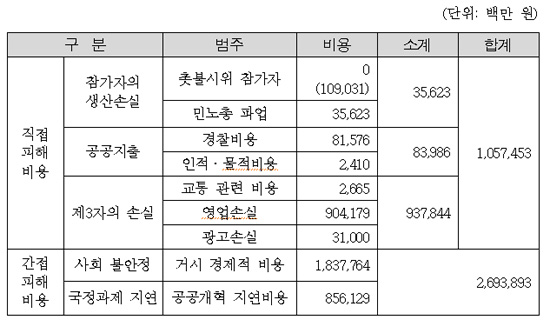 º¸°í¼¿¡ µû¸£¸é »çȸÀû ºñ¿ëÀº Á÷Á¢ÇÇÇØºñ¿ë°ú °£Á¢ÇÇÇØºñ¿ëÀ¸·Î ±¸ºÐµÈ´Ù. Á÷Á¢ÇÇÇØºñ¿ëÀº 1Á¶574¾ï ¿øÀ¸·Î Ãß»êµÆ´Ù. ¹Î³ëÃÑ Á¶ÇÕ¿øµéÀÇ ÆÄ¾÷À¸·Î ÀÎÇÑ »ý»ê¼Õ½Ç¸¸ 356¾ï ¿øÀ̾ú°í °ø°øÁöÃâºñ¿ë(°æÂûºñ¿ë, ÀÎÀû¡¤¹°Àû ºñ¿ë ÇÕ»ê)ÀÌ 840¾ï ¿ø¿¡ ´ÞÇß´Ù.