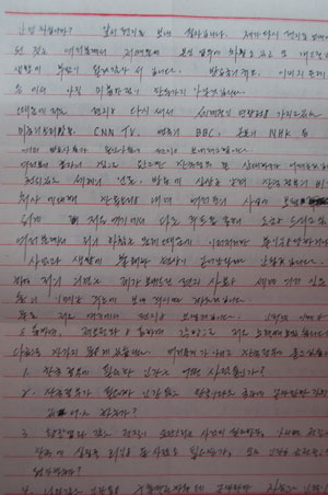 ½ÇÁ¦·Î ¼¾¾´Â ÆíÁö¿¡¼ ¡°Çѱ¹ Á¤ºÎÀÇ Á¤ºÎ(±¹Á¤)¿î¿µ°ú ºÏºÎ Á¶¼±Àε鿡 ´ëÇÑ °áÁ¤ ¹æ½ÄÀÌ ÀúÁúÀûÀÌ°í ¸Å¿ì À¯Ä¡ÇÏ´Ù. ºÏÂÊ Á¤ºÎ¿Í º°¹Ý ´Ù¸£Áö ¾Ê´Ù¡±¸ç Çѱ¹¿¡ ´ëÇÑ ±ØµµÀÇ ÁÂÀý°¨À» ³ªÅ¸³Â´Ù. ±×·¯³ª ±×°¡ ¹«±â·ÂÇÏ°Ô ¸¶³É Á×À½¸¸À» ±â´Ù¸®°í ÀÖ´Â °ÍÀº ¾Æ´Ï¾ú´Ù. ¼ ¾¾´Â ÆíÁö¸¦ ÅëÇØ ÀÚ½ÅÀÌ °ø¾È´ç±¹À¸·ÎºÎÅÍ ´çÇÑ ºñ(Þª)ÀηûÀû ¸¸Çà°ú Çѱ¹ Á¤ºÎÀÇ ¹«Ã¥ÀÓÇÑ Ã³»ç¸¦ Àü ¼¼°è¿¡ Æø·ÎÇÏ·Á Çϰí ÀÖ¾ú´Ù.