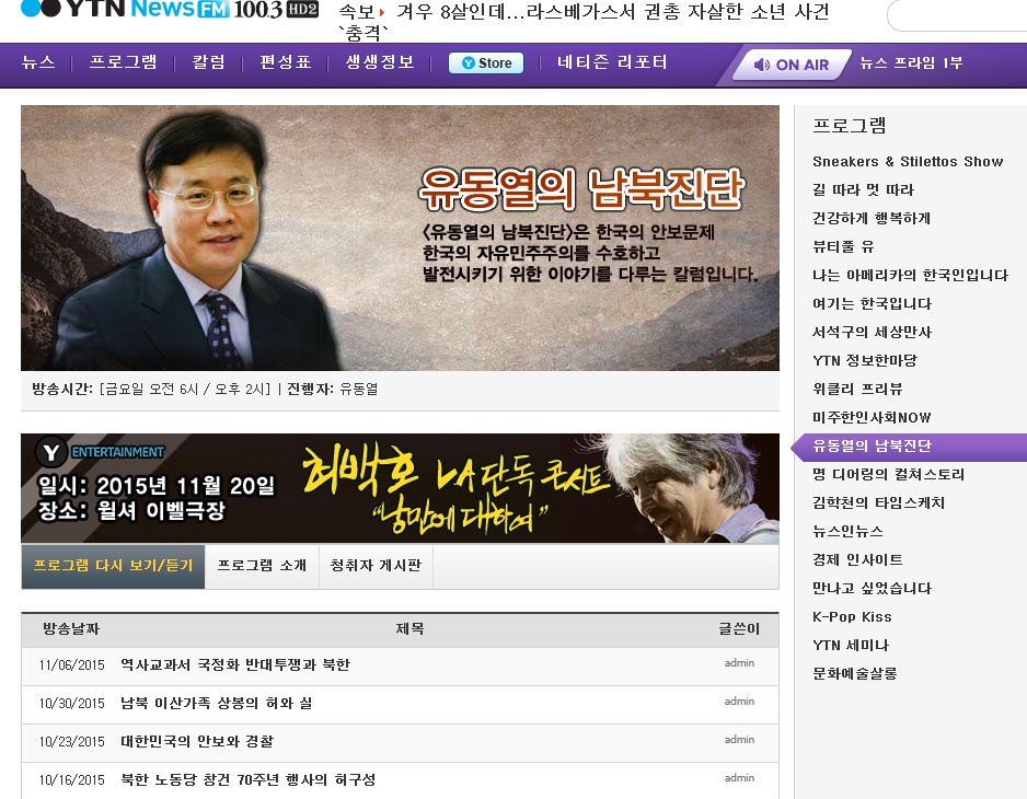 ÀÚÀ¯¹ÎÁÖ¿¬±¸¿ø À¯µ¿¿ ¿øÀåÀÌ YTN NEWS FM(YTN FM 100.3 HD2, ¹Ì±¹ L.A.)À» ÅëÇØ¼ 3¿ù 11ÀÏ(¹Ì±¹ L.A.ÇöÁö½Ã°¢)ºÎÅÍ ¸ÅÁÖ ¸ñ¿äÀÏ ¿ÀÀü 6½Ã±×¸®°í ¿ÀÈÄ 12½Ã ´º½º ½Ã°£ µÚ <À¯µ¿¿ÀÇ ³²ºÏÁø´Ü>À̶õ ¹æ¼ÛÄ®·³À¸·Î ¹Ì±¹ ÇÑÀεéÀ» ã¾ÆºË´Ï´Ù. <À¯µ¿¿ÀÇ ³²ºÏÁø´Ü>Àº Çѱ¹ÀÇ ¾Èº¸¹®Á¦, Çѱ¹ÀÇ ÀÚÀ¯¹ÎÁÖÁÖÀǸ¦ ¼öÈ£ÇÏ°í ¹ßÀü½Ã۱â À§ÇÑ À̾߱⸦ ´Ù·ç´Â Ä÷³ÀÔ´Ï´Ù.
