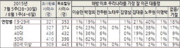 ¾Æ·¡ Ç¥´Â ÃÖ±Ù ¿©·ÐÁ¶»ç±â°ü °¶·´¿¡¼­ Á¶»çÇÑ ¿ª´ë ´ëÅë·É¿¡ ´ëÇÑ Æò°¡´Ù. ¿¬·Éº°·Î ±¸ºÐÇÑ ºÎºÐÀ» ¹ßÃéÇߴµ¥ Àú¿¬·ÉÃþ°ú °í¿¬·ÉÃþÀÇ Æò°¡°¡ ±Ø¸íÇÏ°Ô °¥¸° °ÍÀ» º¼ ¼ö ÀÖ´Ù. ¸¶Ä¡ ¿ø·¡ºÎÅÍ ±×·± °ÍÀÎ ¾ç ¿©±â°í Áö³ªÄ¥ ÀÏÀÌ ¾Æ´Ï´Ù.