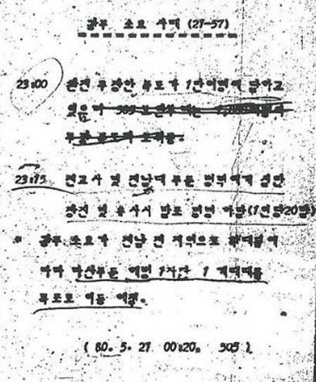 °ø°³µÈ ¹®°ÇÀ» º¸´Ï Á¦¸ñÀº '±¤ÁÖ ¼Ò¿ä »çÅÂ(21-57)'¿´´Ù. ¾Ë·ÁÁø ¹Ù·Î´Â º¸¾È(Çö ±â¹«)ºÎ´ë¿¡¼ ÂÊÁö º¸°íÇÑ ³»¿ëÀÌ´Ù. Á¦¸ñ ¾Æ·¡ ù Ç׿¡´Â '23:00 ¿ÏÀü¹«ÀåÇÑ Æøµµ°¡ 1¸¸¿© ¸í¿¡ ´ÞÇϰí ÀÖÀ½.'À¸·Î µÇ¾î ÀÖ°í À̾îÁø¹®ÀåÀÌ ´õ ÀÖÀ¸³ª ÁÙÀ» ±×¾î Áö¿ö³ù´Ù. ±×´ÙÀ½ Ç×Àº '23:15 Àü±³»ç ¹× Àü³²´ë ÁֵРº´·Â¿¡°Ô ½Çź ÀåÀü ¹× À¯»ç½Ã ¹ßÆ÷ ¸í·É ÇÏ´Þ(1Àδç 20¹ß)·Î µÇ¾î ÀÖ´Ù. ¸¶Áö¸· Ç×Àº º°Ç¥·Î '±¤ÁÖ ¼Ò¿ä°¡ Àü³² Àü Áö¿ªÀ¸·Î È®´ëµÊ¿¡ µû¶ó ¸¶»ê ÁÖµÐ ÇØº´ 1»ç´Ü 1°³ ´ë´ë¸¦ ¸ñÆ÷·Î À̵¿ ¿¹Á¤'À̶ó°í ¾²¿© ÀÖ´Ù. À̰ÍÀÌ ³»¿ëÀÇ ÀüºÎ´Ù.
