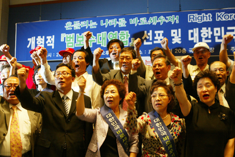 ´ëÇѹα¹ °Ç±¹»ç ¹Ù·Î¼¼¿ì±â, Ä£ºÏÁÂÆÄ¼¼·Â ô°á, ÀÚÀ¯¹ÎÁÖÁÖÀÇ ´ëÇѹα¹ Á¤Å뼺 »ç¼ö µî 3´ë ¾Ö±¹¿îµ¿À» Àü°³ÇØ ¿Â ÀÚÀ¯ÁÖÀÇ °è¿ ½Ã¹Î´ÜüµéÀÌ 2007³â ´ë¼±¿¡¼ ÁÂÆÄÁ¤±Ç Á¾½ÄÀ» À§ÇØ '¹Ý³ë¹«Çö Á¤±Ç'À» ±âÄ¡·Î '¹üº¸¼ö´ë¿¬ÇÕ'À» Ã˱¸ÇÏ°í ³ª¼ °ü½ÉÀÌ ½ò¸®°í ÀÖ´Ù.