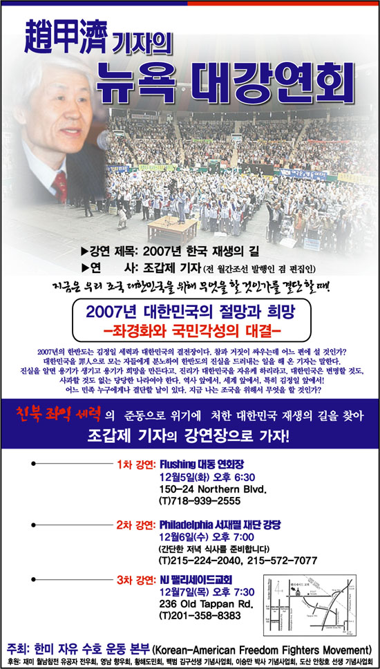 ÇѹÌÀÚÀ¯¼öÈ£¿îµ¿º»ºÎ(»óÀÓ´ëÇ¥ ÃÖÀÀÇ¥)´Â ¹Ì±¹¿¡ °ÅÁÖÇÏ´Â ÇÑÀα³Ç¥µéÀ» À§ÇØ ¿À´Â 5ÀϺÎÅÍ 7ÀϱîÁö Á¶°©Á¦ Àü ¿ù°£Á¶¼± ´ëÇ¥¸¦ ÃÊû ¢¥2007³â ´ëÇѹα¹ÀÇ Àý¸Á°ú Èñ¸Á¢¥À̶ó´Â ÁÖÁ¦·Î ´º¿å¿¡¼­ °­¿¬È¸¸¦ °³ÃÖÇÑ´Ù.