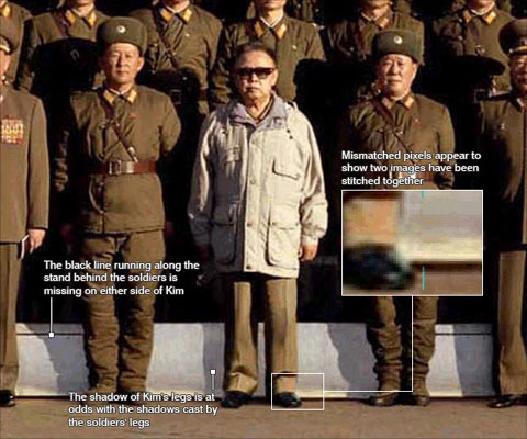 ¿µ±¹ÀÇ BBC ¹æ¼ÛÀº Áö³ ñÎ ºÏÇÑÀÌ °ø°³ÇÑ ±èÁ¤ÀÏ »çÁøÀÌ Á¶ÀÛµÈ °ÍÀ̶ó°í º¸µµÇß´Ù. ±èÁ¤ÀÏÀÌ ±ºÀεé°ú ÇÔ²² Â÷·Ç ÀÚ¼¼·Î ÂïÀº ±â³ä»çÁøÀº ûþáÈ(ȼÒ)°¡ ´Ù¸¥ µÎ »çÁøÀ» ÇÕ¼ºÇÑ °ÍÀÓÀ» ¿µ±¹ÀÇ Å¸ÀÓ½º¿Í BBC°¡ »çÁøºÐ¼®À¸·Î ¹àÇô³Â´Ù´Â °ÍÀÌ´Ù. ±ºÀεéÀÌ ¼ ÀÖ´Â ¹è°æÀÇ ½ºÅĵ忡´Â °¡·Î·Î °ËÀº ¼±ÀÌ ±×·ÁÁ® Àִµ¥ ±èÁ¤ÀÏÀÌ ¼ ÀÖ´Â ¹è°æ¿¡ ³ª¿À´Â ½ºÅĵ忡¸¸ °ËÀº °¡·Î ¼±ÀÌ º¸ÀÌÁö ¾Ê´Â´Ù. ÀÌ´Â ±èÁ¤ÀÏÀÇ »çÁøÀ» ´©±º°¡ÀÇ »çÁø À§¿¡ µ¡¾º¿ü´Ù´Â Áõ°Å´Ù. ±èÁ¤ÀÏ ´Ù¸®ÀÇ ±×¸²ÀÚ¿Í ´Ù¸¥ ±ºÀÎµé ´Ù¸®ÀÇ ±×¸²ÀÚµµ ÀÏÄ¡ÇÏÁö ¾Ê´Â´Ù. BBC´Â ÀÌ »çÁøÀÌ ±èÁ¤ÀÏÀÇ °Ç°ÀÌ»óÀ» È®ÀÎÇÑ ¼ÀÀ̶ó°í º¸µµÇß´Ù. ºÏÇÑÁ¤±ÇÀº Á¤Ä¡Àû ¸ñÀûÀ¸·Î »çÁø Á¶ÀÛÀ» ¿¹»ç·Î Çϱ⠶§¹®¿¡ À̹ø¿¡µµ º° ´Þ¸® ÁÖÀÇÇÏÁö ¾Ê°í ¾û¼ºÇÏ°Ô »çÁøÀ» ÇÕ¼ºÇßÀ» °ÍÀ̶ó°í º¸µµÇß´Ù.