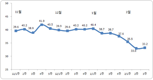 2¿ù Áß¼ø 33.0%¡¦Çö Á¤ºÎ µé¾î °¡Àå ³·Àº ¼öÁØ, Á¤¸ùÁØ-±è¹®¼ö´Â ¹Ý»çÀÌÀÍÀ¸·Î ÁöÁöÀ² »ó½Â.