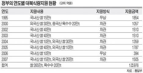 À̵éÀº 1995³âºÎÅÍ 2007³â±îÁö ºÏ¿¡ º¸³½ ½Ä·®ÀÌ ½Ò 265¸¸t¿¡ ¿Á¼ö¼ö 20¸¸tÀ̶ó´Â ÅëÀϺΠÁý°è¸¦ ÀοëÇØ ¡°ºÏÇÑÀÇ ¿¬°£ ½Ä·® »ý»ê·®ÀÌ 400¸¸t, ¼Òºñ·®ÀÌ 540¸¸t ¾ÈÆÆÀÎ Á¡À» °¨¾ÈÇÑ´Ù¸é ±×°£ º¸³½ ´ëºÏ ½Ò Áö¿ø·®Àº ¾öû³ ±Ô¸ð¡±¶ó°í ÁöÀûÇß´Ù.
