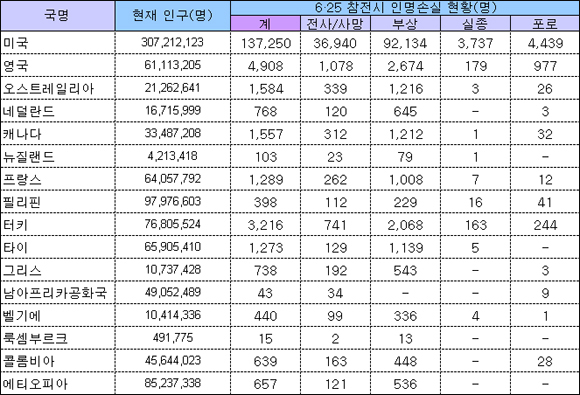ÀÌ Ç¥´Â õ¾ÈÇÔ îúÞÝíº 46¸íÀ» ¹Ý¿µÇÏÁö ¾Ê°í ÀÖ´Ù. Åë°è´Â Çѱ¹ÀÌ ¾ÆÁ÷ ÑÑïáìíÁ¤±Ç°ú ÀüÀïÁßÀ̶õ Çö½ÇÀ» Àß º¸¿©ÁØ´Ù. 1953³â 7¿ù27ÀÏ ÈÞÀü ÀÌÈÄ ±¹±º 4712¸íÀÌ Ä§ÅõÇÏ´Â ºÏÇѱº°ú ÀüÅõ¸¦ ÇÏ´Ù Á×¾ú´Ù. À̶óÅ©îú¿¡¼ Á×Àº ¹Ì±º ¼ýÀÚ¿Í ºñ½ÁÇÏ´Ù. Çѱ¹Àº ÈÞÀü±â¿¡ ´Ù¸¥ ³ª¶óÀÇ ÀüÀï±âº¸´Ù ´õ ¸¹ÀÌ ½Î¿î ¼ÀÀÌ´Ù.