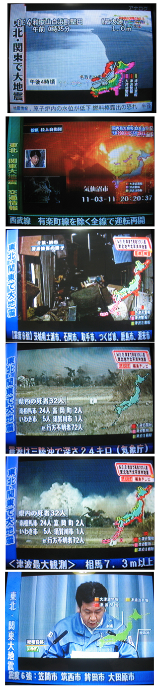 °è¼ÓµÇ´Â ¼Óº¸¸¦ º¸¸ç ÀÚ´Â µÕ ¸¶´Â µÕ ÇÏ¸ç ¹ãÀ» »õ¿ü´Ù. Àá±ñ ÀáÀÌ µé¾îµµ ¸ö¿¡ Èçµé¸²ÀÌ ´À²¸Áö¸é ¹Ù·Î ´«ÀÌ ¶°Á³´Ù. Èçµé¸®´Â »óȲÀÌ ²ÞÀÎÁö ½ÇÁ¦»óȲÀÎÁö È¥µ¿µÇ±âµµ Çß´Ù. ½Ã°£ÀÌ Áö³¯¼ö·Ï »ç¸ÁÀÚ¼ö¿Í Çà¹æºÒ¸íÀÚ¼ö°¡ ´Ã¾î°¬´Ù. NHK, ÈÄÁöTV, ´ÏÈ¥Å×·¹ºñ, ¾Æ»çÈ÷TVµî ¸ðµç ä³ÎÀÌ ½Ã°£º°´ë·Î ¾Æ³ª¿î¼­¿Í Àü¹®°¡µéÀ» ±³Ã¼Çذ¡¸ç Àç³­Áö¿ª »óȲ°ú ¿©Áø Á¤º¸¸¦ ÀüÇß´Ù. º¸È£Çï¸äÀ» Âø¿ëÇÑ ¾Æ³ª¿î¼­°¡ ÁÖÀΰøÀÎ ÅÚ·¹ºñÀü È­¸é À§ÂÊ¿¡´Â, °è¼ÓµÇ´Â ¿©Áø¿¡ ´ëÇÑ ÁöÁø¼Óº¸°¡ °è¼ÓµÆ´Ù. Àü ä³Î °øÅëÀ¸·Î È­¸é ¿À¸¥ÂÊ ¹Ø¿¡´Â ÀϺ» Àüµµ°¡ ¶ç¾îÁ® ÀÖ°í ¾²³ª¹ÌÀÇ À§ÇèÀ» ¾Ë¸®´Â ±ô¹ÚÀÓÀÌ °è¼ÓµÆ´Ù.