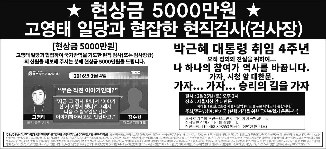 ´ëÅë·ÉźÇٱⰢÀ»À§Çѱ¹¹Î¿îµ¿º»ºÎ(ź±â±¹)´Â ±ÝÀÏ(2¿ù22ÀÏ)í® Á¶¼±ÀϺ¸(A31¸é)¿¡ Àǰ߱¤°í¸¦ ³»°í, <°í¿µÅ ÀÏ´ç°ú ÇùÀâÇÏ¿© ±¹°¡¹Ý¿ªÀ» ±âµµÇÑ ÇöÁ÷ °Ë»ç(¶Ç´Â °Ë»çÀå±Þ)ÀÇ ½Å¿øÀ» Á¦º¸ÇØ Áֽô ºÐ²² Çö»ó±Ý 5000¸¸¿øÀ» µå¸³´Ï´Ù>°í ¹àÇû´Ù.