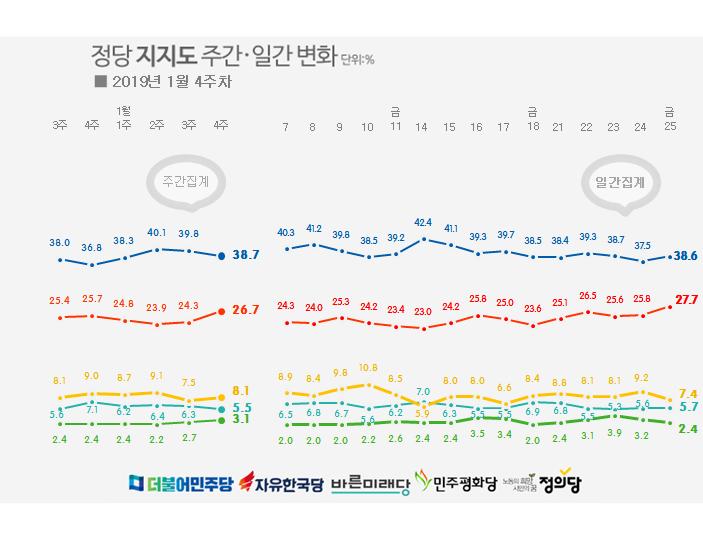 ¸®¾ó¹ÌÅÍ 2019³â 1¿ù 4ÁÖÂ÷ ÁÖ°£Áý°è(¹«¼± 80 : À¯¼± 20, ÃÑ 2,515¸í Á¶»ç)¿¡¼, ÀÚÀ¯Çѱ¹´çÀÌ 1ÁÖÀÏ Àü 1¿ù 3ÁÖÂ÷ ÁÖ°£Áý°è ´ëºñ 2.4%p ¿À¸¥ 26.7%·Î 2ÁÖ ¿¬¼Ó »ó½Â, ±¹Á¤³ó´Ü »çŰ¡ º»°ÝÈÇÑ 2016³â 10¿ù 3ÁÖÂ÷(29.6%) ÀÌÈÄ 2³â 3°³¿ù ±â°£¿¡ °¡Àå ³ôÀº ÁöÁöÀ²À» ±â·ÏÇÑ °ÍÀ¸·Î Á¶»çµÆ´Ù.