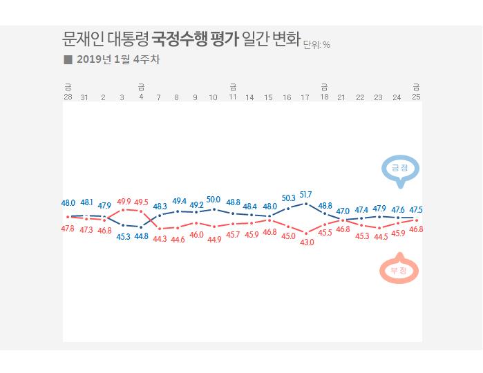 ¹®ÀçÀÎ ´ëÅë·ÉÀÇ ÃëÀÓ 90ÁÖÂ÷ ±¹Á¤¼öÇà ÁöÁöÀ²(±àÁ¤Æò°¡)Àº 1ÁÖÀÏ Àü 1¿ù 3ÁÖÂ÷ ÁÖ°£Áý°è ´ëºñ 1.4%p ³»¸° 47.7%(¸Å¿ì ÀßÇÔ 22.8%, ÀßÇÏ´Â Æí 24.9%)·Î 2ÁÖ ¿¬¼Ó ¼ÒÆø Ç϶ôÇÏ¸ç ¾àº¸ÇÕ¼¼°¡ À̾îÁ³´Ù. ´Ù¸¸ ¿©ÀüÈ÷ ±àÁ¤Æò°¡°¡ ºÎÁ¤Æò°¡¸¦ ¿ÀÂ÷¹üÀ§ ³»¿¡¼ ¾Õ¼± °ÍÀ¸·Î ³ªÅ¸³µ´Ù.