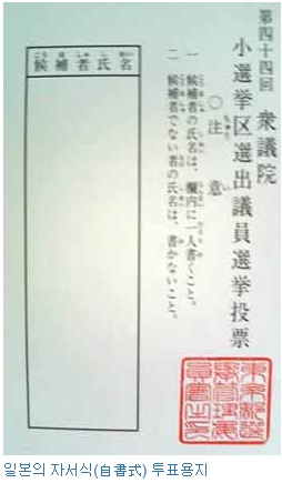 ÀϺ»Àº ÅõÇ¥¿ëÁö¿¡ ÅõÇ¥ÇÒ Èĺ¸ÀÇ À̸§°ú Á¤´çÀ» êóÏííº°¡ Á÷Á¢ ùÓí®·Î ½á¼­ Á¦ÃâÇÏ´Â ¹æ½Ä(í»ßöãÒ)À» ÅÃÇϰí ÀÖ´Ù. ùÓí®°¡ Ʋ¸®¸é ÞÝøù·Î 󸮵DZ⠶§¹®¿¡ À̸§ÀÇ ùÓí®°¡ ¾î·Á¿î Èĺ¸ÀÇ ¿ì 'È÷¶óÄ«³ª'³ª 'īŸī³ª'·Î ¾´´Ù. ±× °á°ú ÀϺ»Àº ÅõÇ¥ÀÇ êóüùáãÀÌ ¸Å¿ì ³ô°Ô ³ª¿Â´Ù.