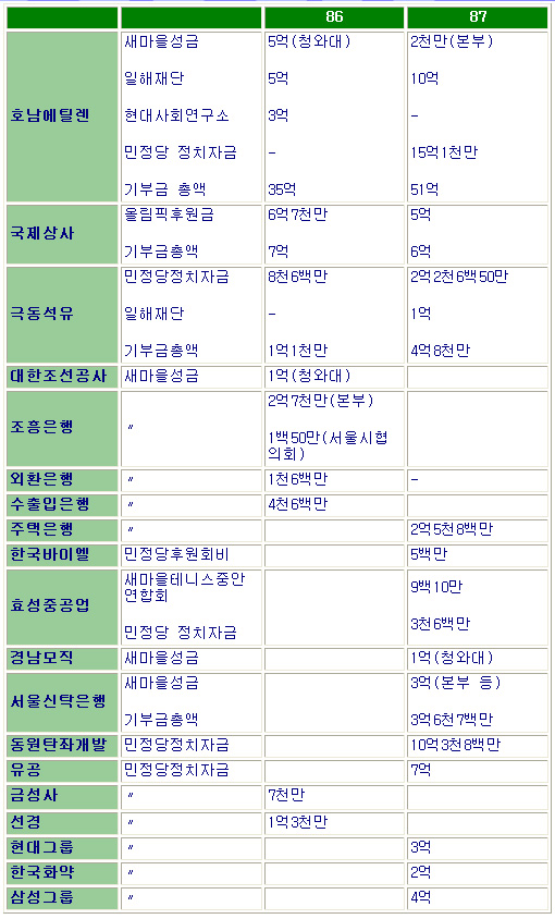 Çö´ë±×·ì¿¡¼­´Â 87³â¿¡ 3¾ï¿øÀ» ¹ÎÁ¤´ç¿¡ Á¤Ä¡ÀÚ±ÝÀ¸·Î ±âŹÇß´Ù. ȸ»çº° ÀåºÎ»óÀ¸·Î´Â ´ÙÀ½°ú °°ÀÌ ¹èºÐ, Á¤¸®µÇ¾ú´Ù.