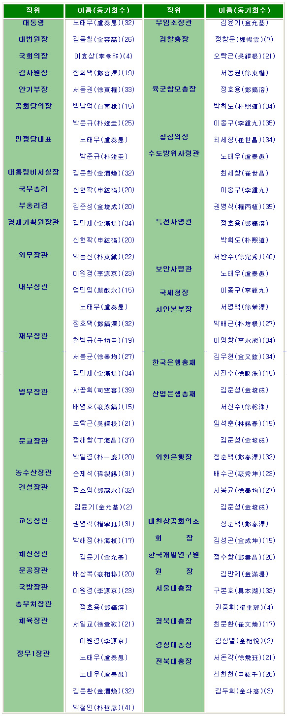 °æºÏ°í±³´Â ´ëÅë·É(ÒÆ÷Áé×), ±¹È¸ÀÇÀå(ì°üøßÔ), ´ë¹ý¿øÀå(ÑÑé»ôÊ), ±¹¹«ÃѸ®(ãéúèü)¸¦ ¹èÃâÇÑ Çб³´Ù. ¿©´ç´ëÇ¥µµ ¼¼ »ç¶÷(¹é³²¾ï.ÛÜÑõåå, ÚÓñÝФ, ÒÆ÷Áé×)À» ¹èÃâÇÏ¿´´Ù. °æºÏ°íÃâ½ÅÀÇ ¿ª´ëÀå°üÀº 24¸íÀÌ´Ù. À̵éÀº ¿¬ 37ȸ¿¡ °ÉÃÄ Àå°üÀ» ¿ªÀÓÇß´Ù. Àå°üÀº ¾Æ´ÏÁö¸¸ ¾È±âºÎÀå°ú °°Àº Àå°ü±Þ ¿äÁ÷°æ·ÂÀÚ¸¦ º¸Å¸é 27¸íÀÌ´Ù. °æºÏ°íÃâ½Å Àå°üµéÀÌ ¿ªÀÓÇÑ ºÎó´Â 17°³ÀÇ °¢°¢ ´Ù¸¥ ºÎó·Î¼ Çѵ¥ ¸ðÀ¸¸é ¿ÂÀüÇÑ ³»°¢À» ±¸¼ºÇÒ ¼ö ÀÖÀ» ¸¸Å ´Ù¾çÇÏ´Ù. ì°ã¯Ø¹Á¤±Ç¶§ Àå°üÀ» Áö³½ À̰¡ 1¸í, íåØõ Á¤±Ç¶§ Àå°üÀÌ 1¸í, ÚÓïáý÷ Á¤±Ç¶§ Àå°üÀÌ 15¸í, îïÔàüº Á¤±Ç ¶§°¡ 8¸í, ÒÆ÷Áé×Á¤±Ç¶§°¡ 4¸íÀÌ´Ù.