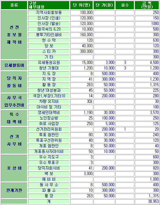 Áö³ 4.26ÃѼ±¶§ ¼¿ï°ºÏÁö¿ªÀÇ ¸ð´ç Èĺ¸Ãø¿¡¼ ¸¸µç ¼±°Å¿îµ¿ ¼Ò¿ä ¿¹»êÆÇ´Ü¼°¡ Çϳª ÀÖ´Ù. ÃÑ¿¹»êÀ» 3¾ï8õ9¹é53¸¸¿øÀ¸·Î Àâ¾Ò´Ù. À¯¼¼ÀåÀÇ Ã»Áßµ¿¿øºñ°¡ 15%·Î °¡Àå ¸¹°í, ¼±Àüºñ°¡ ¾à 10%. µ·ºÀÅõ µ¹¸®±â·Î ÃßÃøµÇ´Â ¿µ¼¼¹Î´ëÃ¥ºñ°¡ ¾à 9%, 3¹é 57¸íÀÇ ´ç ±â°£ Á¶Á÷¿ø Ȱµ¿ºñ°¡ 8%¿´´Ù. ¼±°ÅÀü¹®°¡µé¿¡ ÀÇÇϸé ÀÌ ¿¹»ê¿¡´Â ¼±¹°ºñ¿Í ÀÏ´çÀ» ¹Þ´Â ¼±°Å¿îµ¿¿ø ºñ¿ëÀÌ Æ÷ÇÔµÇÁö ¾Ê¾Ò´Ù°í ÇÑ´Ù. ±×°Í±îÁö Ä¡¸é ÀÌ ¼±°Å±¸¿¡¼´Â ÃÖÀú 8¾ï¡10¾ï¿øÀÌ ¾²¿©Á³À» °ÍÀ̶ó°í ÇÑ´Ù. ƯÈ÷ ¿©´çÀÇ ¼±°Å¿îµ¿¿¡¼´Â ¼±¹°°ú µ·ºÀÅõ¸¦ µ¹¸®´Âµ¥ ÇÊ¿äÇÑ ÀΰǺñ°¡ ¸¹ÀÌ ¸ÔÈ÷°í, Á¶Á÷ÀÌ º¹ÀâÇÏ¿© À§¿¡¼ µ·À» µéÀ̺ξ Áß°£ Áß°£¿¡¼ ´©¼ö Çö»óÀÌ ÀϾ À¯±ÇÀÚ¿¡°Ô Àü´ÞµÉ ¶§´Â »ó¼öµµÀÇ Æò±Õ´©¼öÀ²(30%)¸¦ ÈξÀ ³Ñ´Â °á°ú°¡ ºú¾îÁö±âµµ ÇÑ´Ù.
