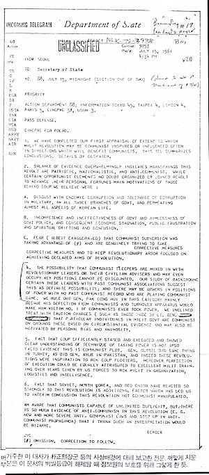 ÚÓïáý÷´Â °ø»êÁÖÀÇÀÚÀÇ ±æÀ» û»êÇßÁö¸¸ °ø»êÁÖÀÇÀÚ¿´´Ù´Â °æÇèÀº ´ëÅë·ÉÀÌ µÈ µÚ ±×ÀÇ Á¤Ã¥À̳ª Çൿ¿¡ ÀûÁö ¾ÊÀº ÀÚÃ븦 ³²°å´Ù. ÚÓïáý÷¼ÒÀåÀÌ 5¡¤16Äíµ¥Å¸¸¦ ¼­µÑ°Ô µÈ ÇÑ ¿øÀεµ ¹Ì±ºÀÌ ÚÓ¼ÒÀåÀÇ »ç»óÀ» ÀǽÉÇÏ¿© ±×¸¦ ±º¿¡¼­ ³»¸ô·Á°í Ç߱⠶§¹®À̾ú´Ù. 1963³âÀÇ ´ëÅë·É ¼±°Å¿¡¼­ ºÒºÙ¿´´ø »ç»ó³íÀïÀº ÚÓïáý÷Èĺ¸ ÂÊ¿¡¼­ À±º¸¼±(ëÅÜÉà¼)È常¦ ¿ë°øÁ¶ÀÛÀ¸·Î ºñ³­ÇÏ´Â ½ÄÀ¸·Î ÁøÇàµÇ¾ú¾ú´Ù. ±×¶§ °øÈ­´ç¿¡¼­´Â Àü±¹ÀÇ ±º´ÜÀ§¸¶´Ù ¼öõ¸í¾¿ÀÇ »ç»óÀü·Â(îñÕö)¿¡ ÀÇÇÑ ÇÇÇØÀÚ¿Í ±× ģôÀÌ ÀÖ´Â °ÍÀ¸·Î ÆÄ¾Ç, À̵éÀÇ Ç¥¸¦ ÀǽÄÇß¾ú´Ù°í ÇÑ´Ù. ÀÌ·± ºÐ¼®¿¡ ±Ù°ÅÇØ¼­ÀÎÁö ÚÓÈ帴 »ç»ó³íÀïÀÌ ½Å¹®¿¡ Å©°Ô ³ªµµ·Ï À¯µµÇ϶ó´Â Áö½Ã¸¦ ³»·È´Ù´Â °ÍÀÌ´Ù. ±×·¯³ª ÚÓ´ëÅë·ÉÀº ÀÚ½ÅÀÌ °ø»êÁÖÀÇ¿Í ¹«°üÇÔÀ» ÀÔÁõÇÏ·Á´Â ³ë·ÂÀ» Çϱ⵵ ÇÏ¿´´Ù.