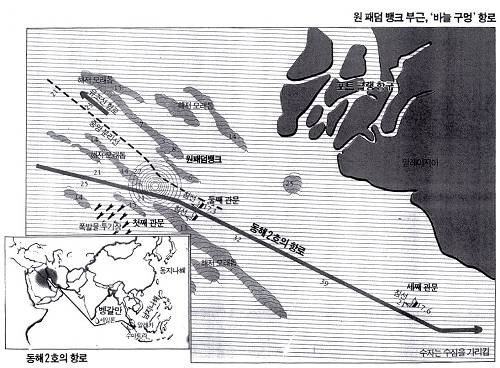 ÇÏ¿À 5½Ã30ºÐ 'µ¿ÇØ'´Â µÎ ¸»¶Ò »çÀÌ ÇѰ¡¿îµ¥¸¦ Áö³ª°¬´Ù. »¡° ºÎÀ̸¦ Åë°úÇÏ¸é¼ ÀÌ ¼±ÀåÀº º¯Ä§ Áö½Ã¸¦ ³»·È´Ù. 1¹é7µµ¿¡¼ 1¹é16µµ·Î, 1¹é7µµ ¹æÇâÀ¸·Î °ðÀå °¡¸é 5ų·Î¹ÌÅÍ ¾Õ¿¡ ÀÖ´Â ¶Ç ´Ù¸¥ ħ¸ô¼± ºÎ±ÙÀ» Áö³ª°¡°Ô µµ¾î ÀÖ¾ú´Ù. ÀÌ Ä§¼±Àº ÇØ¸é À§·Î µå·¯³ªÁø ¾Ê¾ÒÁö¸¸ ±× ºÎ±ÙÀº ¼ö½É 15¡18¹ÌÅÍ. ÀÌ Á¦2ÀÇ Ä§¼± ¹Ù·Î ³²ÂÊ¿¡´Â Á¦3ÀÇ Ä§¸ô¼±ÀÌ ¹¯Çô ÀÖ´Ù. ù °ü¹®À» Åë°úÇÑ µ¿ÇØ´Â µÎ ¹øÂ° ³°üÀΠħ¼± °ñ¸ñÀ» ºüÁ®³ª°¡¾ß Çß°í ±×·¡¼ 5ų·Î¹ÌÅ͸¦ ¾ÕµÎ°í º¯Ä§ÇÑ °ÍÀ̾ú´Ù. °ðÀº ¹°±æÀÌ ¹è ²Ç¹«´Ï¿¡¼ ÅÁ÷ÇÑ ¿øÈ£¸¦ ±×¸®±â ½ÃÀÛÇß´Ù. µÎ Ä¡¼± »çÀÌÀÇ °Å¸®´Â ¾à 1õ ¹ÌÅÍ. Åõ¼ö ÀÌ´öÀÎ ¼±Àå´Â 5ų·Î¹ÌÅÍ ¾Õ¿¡¼ °øÀ» ´øÁ® 1ų·Î¹ÌÅÍ ³ÊºñÀÇ ½ºÆ®¶óÀÌÅ©Á¸À» ¸ÂÃß¾î¾ß ÇÏ´Â °ÍÀÌ´Ù.