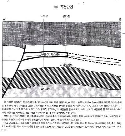 ÀÌ ±×¸²Àº Ÿ¿øÇüÀÎ MÀ¯ÀüÀÇ ´ÜÃà(¾à 10km)À» µû¶ó ÀÚ¸¥ ´Ü¸éÀÌ´Ù. ÀÌ ±¸Á¶ÀÇ ¿ÞÂÊ¿£ ±â¸§ÀÌ ´Þ¾Æ³ªÁö ¸øÇϵµ·Ï ÇÏ´Â ´ÜÃþÀÌ ÀÖ¾î À¯ÀüÀÇ ¼ÂÊ °æ°è¼±À» ÀÌ·é´Ù. Æò°¡Á¤Àº µ¿ÂÊ °æ°è¼±À» ãÀÚ´Â °ÍÀÌ´Ù. ½ÃÃßÁ¤¿¡¼ ±â¸§ ¹× °¡½º´Â ÁöÇÏ 1585 ~1768m »çÀÌÀÇ ¿©·¯°ã »ç¾ÏÃþ¿¡ °¡µæ µé¾î ÀÖ¾ú´Ù. Æò°¡Á¤ ±¼Âø¿¡¼± ÀÌ »ç¾ÏÃþÀ» Ž»ç ¸ñÇ¥·Î Çϰí ÀÖ´Ù. ÀÌ »ç¾ÏÃþÀº ¹ØÀ¸·Î ÈÖ¾îÁ® ³»·Á°¡ Æò°¡Á¤¿¡¼± ½ÃÃßÁ¤º¸´Ùµµ 1¹é30 ~1¹é80m Âë ´õ ±íÀº °÷¿¡¼ ¹ß°ßµÉ °ÍÀÌ´Ù. Ç寮»ç¿¡¼± Æò°¡Á¤¿¡¼ ÀÌ À¯ÃþÀ» ÆÄ³»·Á °¡¸é¼ ÁöÃþ ´Ü¸éÀ» Àß¶ó ³»¾î ±â¸§ÀÇ ÇÔÀ¯»óŸ¦ Á¤¹ÐºÐ¼®Çϰí ÀÖ´Ù. MÀ¯ÀüÀÇ ¸ÅÀå·®Àº À¯Ãþ(»ç¾ÏÃþ)ÀÇ µÎ²²¿Í ºÐÆ÷ ¹üÀ§, Áï üÀûÀÌ ¹àÇôÁö¸é Á¤È®ÇÏ°Ô ³ª¿À°Ô µÈ´Ù.