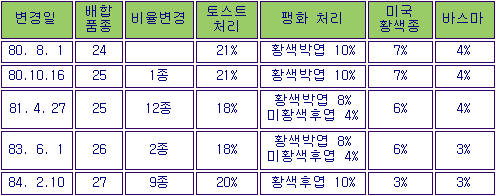 ÀÌ ¼ººÐ ¹èÇÕÇ¥ÁØÀ̾߸»·Î ´ã¹è ¸ÀÀ» °áÁ¤ÇÏ´Â °¡Àå Áß¿äÇÑ ³ë¿ìÇÏ¿ìÀÌ¸ç ´ã¹èÁ¦Á¶È¸»ç¿¡¼ °¡Àå ¼ÒÁßÇÑ ºñ¹Ð·Î »ï°í ÀÖ´Â ÀÚ·á´Ù. ¿ì¸® Àü¸Åû¿¡¼± ¡¸Æò»ý¼±È£´ã¹è¡¹ ¡¸¿ì¸® ÀÔ¸À¿£ ¿ª½Ã ¿ì¸® ´ã¹è¡¹¶õ ±¸È£¸¦ ³»°É°í ÀÖ´Ù. ±×·¸°Ô µÇ·Á¸é ¹èÇÕÇ¥ÁØÀÌ »ó´ç±â°£ °íÁ¤µÅ ¸Àµµ º¯ÇÏÁö ¾Ê¾Æ¾ß ÇÑ´Ù. °¨»ç¿ø Á¶»ç¿¡ µû¸£¸é ¼Ö´ã¹è´Â Áö³ 80³â 8¿ù 1ÀÏ ½ÃÆÇµÈ ÀÌÈÄ Áö³ÇØ 2¿ù±îÁö »çÀÌ¿¡ ³× Â÷·Ê³ª ¹èÇÕºñÀ²ÀÌ º¯°æµÆ´Ù. 80³â10¿ù 16ÀÏ¿£ ´çÃÊ 24Á¾ÀÇ ¼ººÐ¿¡ 1Á¾À» Ãß°¡Çß°í, 81³â 4¿ù 27ÀÏ¿£ 25Á¾ Áß È²»ö Á¾ ÀÙ´ã¹èÀÇ È¥ÇÕ·ü µî 12°¡ÁöÀÇ ¼ººÐºñÀ²À» ¹Ù²å´Ù. 83³â 6¿ù 1ÀÏ¿£ ¸À ÃËÁøÁ¦ÀÎ ¿Ü»ê¹Ù½º¸¶ ÀÙ´ã¹è µî 2Á¾ÀÇ È¥ÇÕ·ü, 84³â 2¿ù 10ÀÏ¿£ Ȳ»ö Á¾ ÀÙ´ã¹è ÈÄ¿±(ý§ç¨)µî 9Á¾ÀÇ È¥ÇÕ·üÀ» ¹Ù²å´Ù. ½ÃÆÇ°³½Ã ´ç½ÃÀÇ 24Á¾ ¼ººÐ ¹èÇÕºñÀ² °¡¿îµ¥ º¯ÇÏÁö ¾ÊÀº °ÍÀº 3Á¾»ÓÀ̾ú´Ù. ÀÌ ¶§¹®¿¡ ¸ÀÀÌ °³¾ÇµÆ´ÂÁö ¿©ºÎ´Â ¾Ë ±æÀÌ ¾øÁö¸¸ ¸ÀÀÌ ´Þ¶óÁø °ÍÀº È®½ÇÇÏ´Ù.