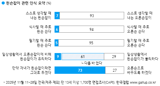 Çѱ¹°¶·´ÀÌ 2025³â 11¿ù 11~28ÀÏ Àü±¹(Á¦ÁÖ Á¦¿Ü) ¸¸ 13¼¼ ÀÌ»ó 1,700¸í¿¡°Ô ½º½º·Î ¿Þ¼ÕÀâÀ̶ó°í »ý°¢ÇÏ´ÂÁö ¿À¸¥¼ÕÀâÀ̶ó°í »ý°¢ÇÏ´ÂÁö ¹°Àº °á°ú, 7%°¡ ¡®³ª´Â ¿Þ¼ÕÀâÀÌ¡¯¶ó°í ´äÇß´Ù. ¿Þ¼ÕÀâÀÌ ºñÀ²À» ¿¬·Éº°·Î º¸¸é 13~18¼¼(ÀÌÇÏ '10´ë') 13%, 19~29¼¼(ÀÌÇÏ '20´ë') 12%, 30´ë 8%, 40´ë 6%, 50´ë 4%, 60´ë ÀÌ»ó 3%´Ù.