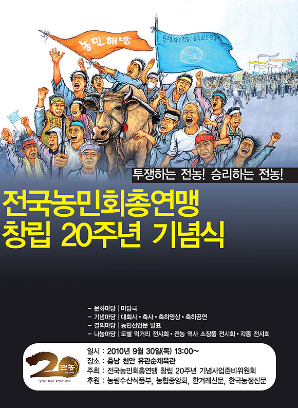 ÇÑÆí ¡°ÅõÀïÇÏ´Â Àü³ó! ½Â¸®ÇÏ´Â Àü³ó!¡±À̶õ ±âÄ¡¸¦ ³»°Ç Àü³óÀº À̹ø Çà»ç¿Í °ü·Ã, ¡°³ó¹ÎÇØ¹æ°ú ÀÚÁÖ¡¤¹ÎÁÖ¡¤ÅëÀÏÀÇ ¿°¿øÀ» ´ã¾Æ 1990³â 4¿ù 24ÀÏ Àü±¹´ÜÀϳó¹Î¿îµ¿Á¶Á÷À¸·Î ⸳ÇÑ Àü³óÀÌ ¾î´À»õ ½º¹« »ì û³âÀÇ ³ªÀ̰¡ µÇ¾ú´Ù¡±¸ç ¡°¿ª»çÀû Ã¥¹« ¡®´ë¾È³ó¾÷¡¤ÅëÀϳó¾÷À» ÅëÇÑ ½Ä·®Áֱǽô롯¸¦ ¿¾î°¡±â À§ÇØ ³ó¹Îȸ¿ø µ¿ÁöµéÀ» ¸ð½Ã°í Àü³ó ⸳ 20Áֳ⠱â³ä½ÄÀ» ÁøÇàÇϰíÀÚ ÇÑ´Ù¡±°í ¹àÇû´Ù.