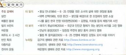´ÙÀ½Àº (ÁÖ)¹Ì·¡¿£ÄÃó±×·ì(ÏÁ ´ëÇѱ³°ú¼) ¹ßÇà °íµîÇб³ Çѱ¹»ç ±³°ú¼ 350, 402ÆäÀÌÁöÀÇ ¡®´Ü¿ø¸¶¹«¸®¡¯ ñé <´õ ¾Ë¾Æº¸±â>¶ó´Â ÄÚ³ÊÀÇ ³»¿ëÀÌ´Ù. µÎ ´Ü¿øÀº °¢°¢ 1945³â~Çѱ¹ÀüÀï(8°ú)°ú Çѱ¹ÀüÀï ÀÌÈÄ~ÇöÀç(9°ú)¸¦ ´Ù·é ºÎºÐÀÌ´Ù.